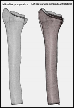 Figure 1. Comparison of the pre-operative left radius and the healthy side, mirrored radius.