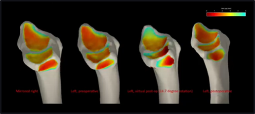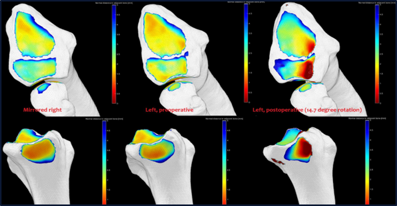Figure 2. Distance mapping performed with the Bonelogic® 2.0 to quantify the simulated post-operative outcome after performing a 14.7° rotation.